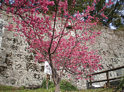 丹鶴城天守跡への登り口、石段左側に、「50年の樹」説明版が立っている。平成8年1月に植樹とともに立てられたもので、次の表記がある。-「日本が、太平洋戦争に敗れた五十年前、この世に生を受け、戦後五十年の歴史を平和の中に歩んできた我ら。永遠の平和を祈念し、ここに新宮の街の発展を願い、ここに植樹す。昭和三十三年三月 千穂小学校卒業生有志」。団塊の世代より上の世代、敗戦の年の生まれの面々。千穂小学校では中上健次の1年先輩、クラスは3組しかなく生徒数の一番少ない世代。植樹した緋寒桜(ひかんざくら)は、当地では一番早く2月中ごろには、濃いピンク色の花弁を付ける。
