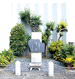 ここより山側に50メートルほど行った右奥、新宮市民会館玄関の右側に、佐藤春夫の「筆塚(ふでづか)」が立っている。城跡を背に、高さ150センチの石柱に、那智黒石がはめ込まれ、無二の親友で詩人の堀口大学(ほりぐち・だいがく)の揮毫(きごう)で「佐藤春夫筆塚」と書かれている。石の中には、春夫が愛用した毛筆とモンブランの万年筆とが納められている。1966(昭和41)年6月の除幕式には、大学も初めて新宮を訪れている。毎年、11月3日の文化の日には、市内の高校生も参加して「筆供養(ふでくよう)」が営まれている。