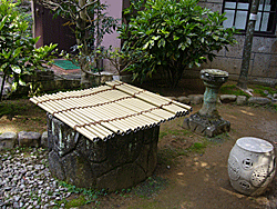 記念館入口のアーチ型の門や周囲を囲む塀、玄関に通じる石畳を含む庭のあたりはいずれももとの姿を模して作ったもの。もともと関口町の敷地は、明治の初め日本の郵便制度を作ったことで知られる前島密(まえじまひそか・今も1円切手の肖像としてつかわれている)の広い屋敷の一部で、玄関脇に残る井戸(囲い部分だけ)は前島邸以来のものの模作。 春夫ははじめこの井戸を埋めたいと考えたが、4年前(大正12年)の関東大震災の時、近所の人々がこの井戸で随分助かったという話を耳にし、残すことに決めたという。 井戸の横の石の造形物は、日時計の土台の部分、春夫邸から持参したもの、時間測定の針は紛失してしまっている。