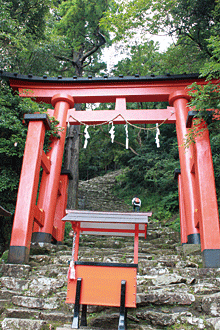 鳥居前から見上げると、迫りくるような、あまりの急勾配(こうばい)の石段にまずは圧倒される。中の地蔵と呼ばれる途中までが、この急勾配。中の地蔵には千体ほどの地蔵が祭られていたが、それらは明治期の廃仏毀釈(はいぶつきしゃく)により谷間に打ち捨てられたと言う。 538段と伝えられている石段は、建久4(1193)年源頼朝が那智山社殿の復興とともに、寄進したと言われている。お燈祭りはこの石段を松明の火を頼りに駆け下る。「下り龍」と譬(たと)えられる所以(ゆえん)。 鎌倉積みの石段は、無雑作に積み重ねられているようだが、一定の筋肉だけに負担を掛けないような「合理性」も考慮されているのだという解釈もある。 那智の滝の飛瀧神社から那智大社へ向かう杉並木の間の裏参道にも、「鎌倉積み」の石道が残っている。