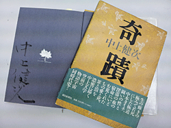 中上健次の「奇蹟」の第一章「タイチの誕生」は、次のように始まる。-「どこから見ても巨大な魚の上顎(うわあご)の部分に見えた。その湾に向かって広がったチガヤやハマボウフウの草叢(くさむら)の中を背を丸めて歩いていくと、いつも妙な悲しみに襲われる。トモノオジはその妙な悲しみが、巨大な魚の巨大な上顎に打ち当たる海の潮音に由来すると信じ、両手で耳を塞ぐのだった。(略)(トモノオジは)日が魚の上顎の先にある岩に当たり水晶のように光らせる頃から、湾面が葡萄(ぶどう)の汁をたらしたように染まる夕暮れまで、ほとんど日がな一日、震えながら幻覚の中にいた。(略)精神病院の職員に見とがめられなかったら、湾一面が真紅に変わる頃まで、そのままの姿でトモノオジはいるのだった。巨大な魚は路地の何人もの者がそうだったように、体中の血を吐き出して呻(うめ)いているのだった。」-「奇蹟」は、これまでの「オリュウノオバ」に加えて、語り手の「トモノオジ」が登場、「語り」が複層的に展開する。