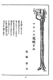 春夫の愛したマロニエの樹は、もとの佐藤邸から移植されたもの。このマロニエは、医師の弟秋雄が昭和5~6年ごろ留学先のウィーンからの帰途パリに立ち寄り、そこで拾ってきた種が目を出したもの。弟秋雄は昭和16年40歳過ぎの若さで亡くなっただけに、春夫には弟への想いのよすが。 昭和24年の長詩「マロニエの花咲きぬ」(昭和24年「改造」発表)は、父の思いを継ぐべき運命にあった弟・秋雄を偲(しの)び、哀切(あいせつ)極まりない作品になっている。結びは「知らず 紀の国の牟婁(むろ)の郡(こほり)/黒潮の海岸(うみぎし)にマロニエ花咲くやいかに。」であったが、マロニエは移植して一度だけ花を付けて平成11年、ついに枯死。花を付けたのはその年の春夫忌の5月6日であった。いまは、別の樹を移植。