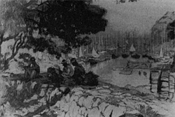1913(大正2)年新宮を再訪して西村伊作邸にしばらく滞在した画家石井柏亭は、池田港の風景を「滞船」で描いている。テンペラ画で色彩豊か。夏の強い日差しの下、木陰で網を編む労働者、筏(いかだ)の向こう林立する滞船の帆柱。柏亭31歳の時の作品は、この年の第7回文展で入選、話題となる。柏亭にとっては1909(明治42)年の夏以来の再訪。柏亭はその後、西村伊作が東京・駿河台(するがだい)に開校する文化学院の有力な援助者となる。