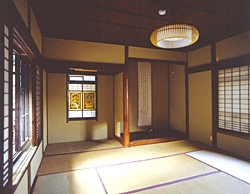 当初、ここは母・千代とともに同居していた谷崎鮎子(あゆこ)がよく使っていたといわれる部屋。鮎子はのちに春夫の甥で慶應大教授になる竹田龍児(たけだりゅうじ)と結婚し、やがて佐藤邸のすぐそばに住むことになる。常設展では、東京・西武百貨店での春夫一周忌展の写真と、その時に寄せられた門弟の代表者安岡章太郎(やすおかしょうたろう)ら9人のメッセージの直筆を展示。メッセージはそれぞれの個性から、師・春夫の人となりを実によくつかみ、表現してくれている。また、それから奥の方に(西洋画の)ポスターをガラスにはめた障子がある。まるで、ステンドグラスのようであるが、このポスターは弟・秋雄がヨーロッパから持ち帰ったもの。春夫はこうして亡き弟を偲んでいた。天井は屋久杉使用の立派なもの。
